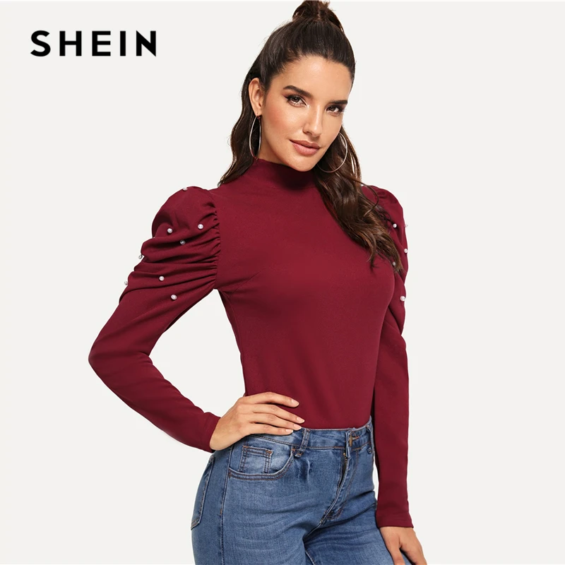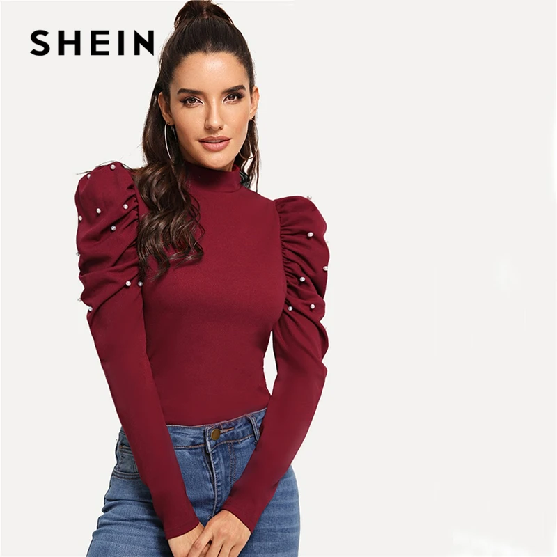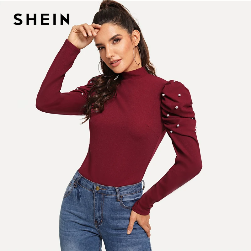 amazing SHEIN Burgundy Office Lady Ruffle Pearls Beaded Mock Neck Puff Sleeve Blouse Autumn Elegant Workwea