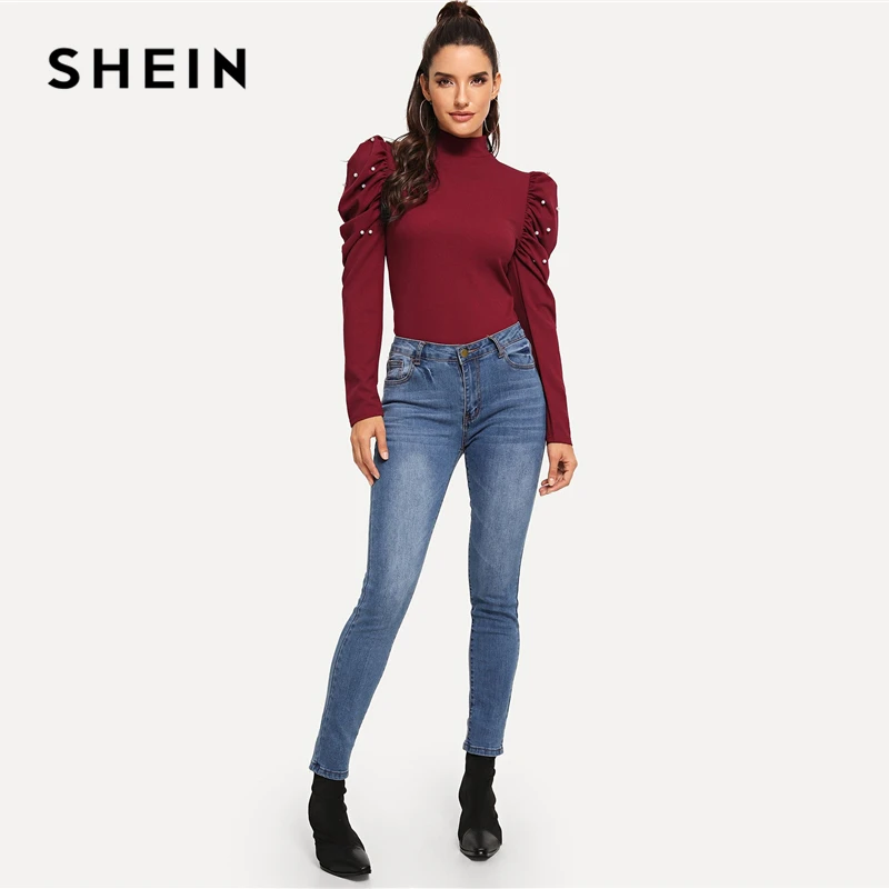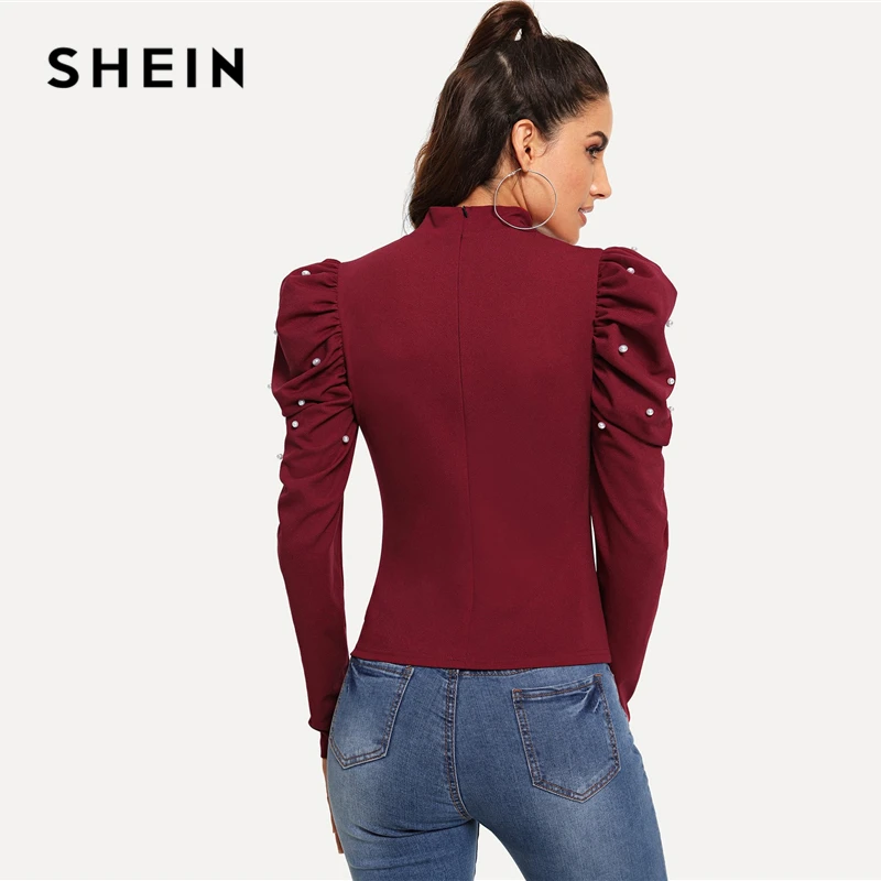 price cut SHEIN Burgundy Office Lady Ruffle Pearls Beaded Mock Neck Puff Sleeve Blouse Autumn Elegant Workwea
