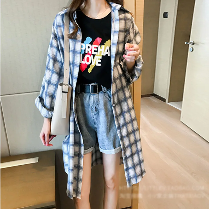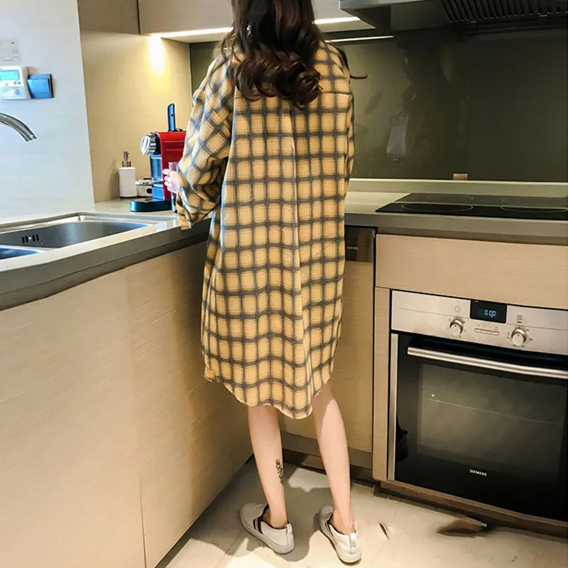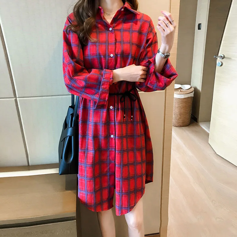 low cost VogorSean Summer Womens Blouses Shirt Plaid 2019 BF Long Sleeve Plus size Long section Women Plaids