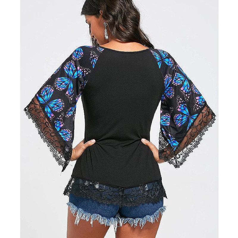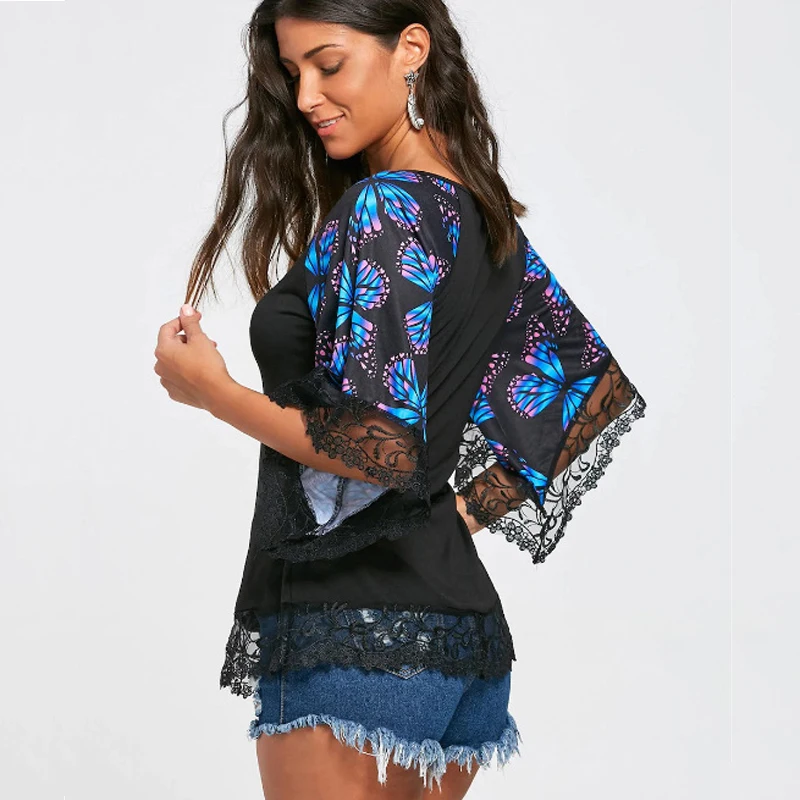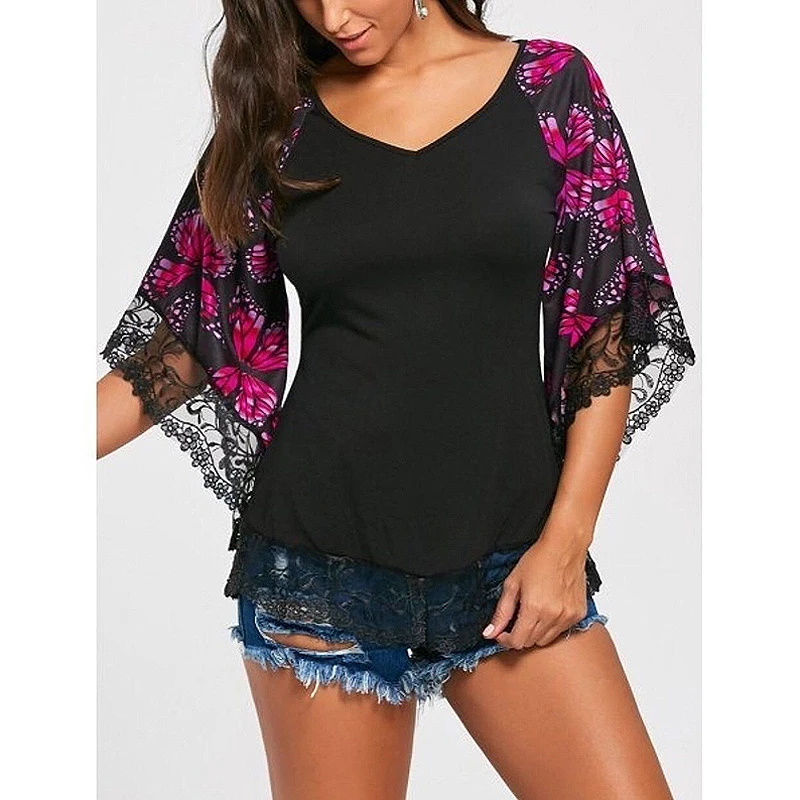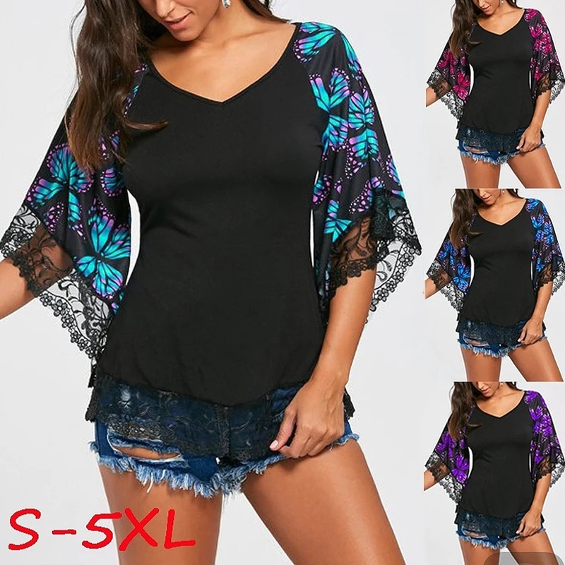 discounted 2019 Fashion Womens Tops And Blouses Summer 3/4 Sleeve Sexy Lace Blouse V Neck Casual Tops Large P