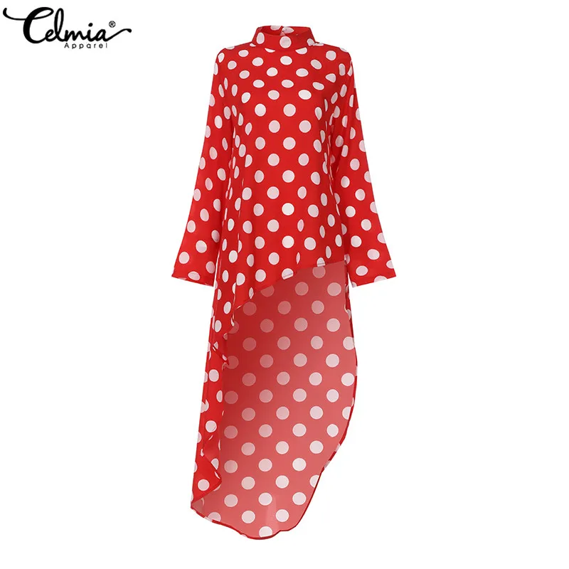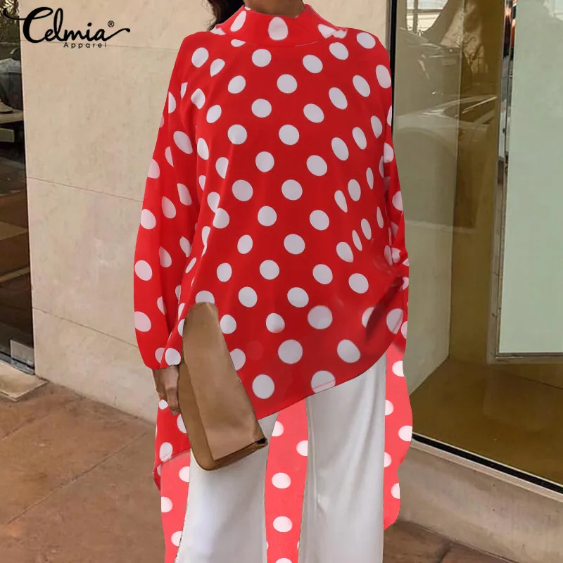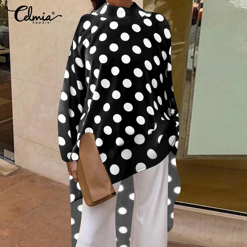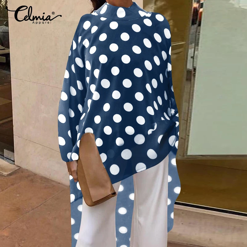 Finest 2019 Celmia Women Dot Print Blouses Vintage Shirts Casual Loose Long Sleeve Asymmetrical Tunic Tops
