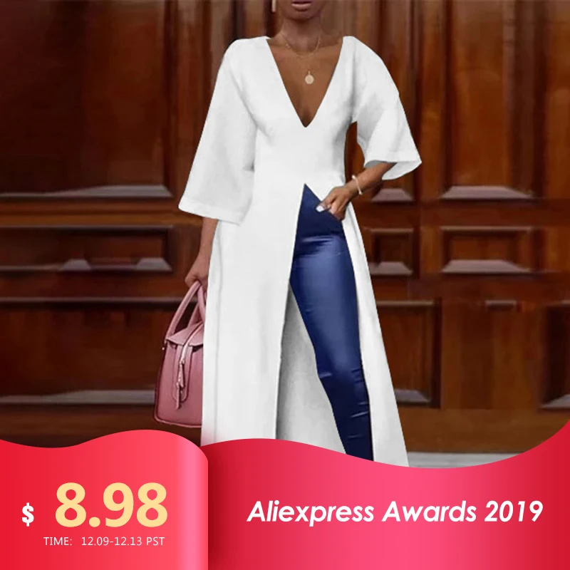 Greatest VONDA Women Sexy V Neck Split Hem Long Shirts Cocktail Party Sexy Dress OL Office Long Blouses Fema