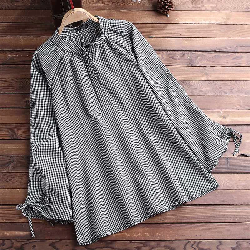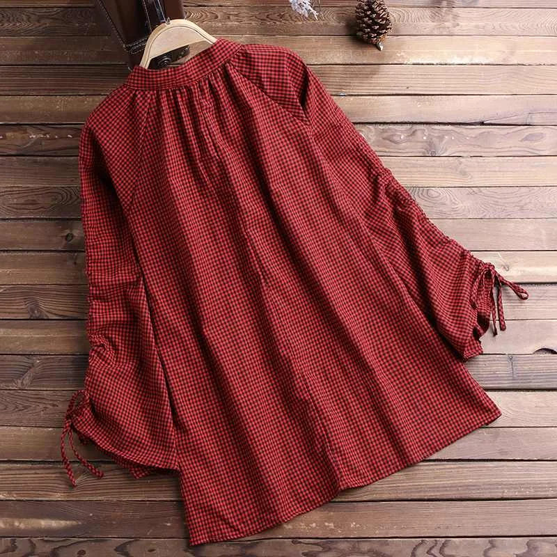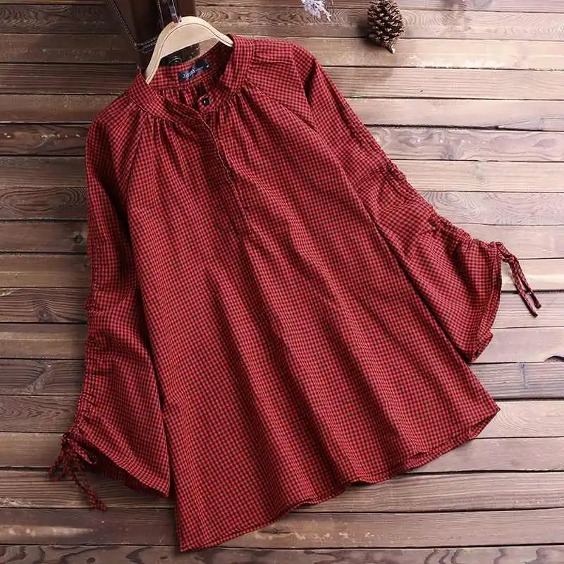 astounding ZANZEA Women Shirt Check Plaid Blouse Long Flare Sleeve Pleated Blusas Vintage Loose Tops Cotton Li