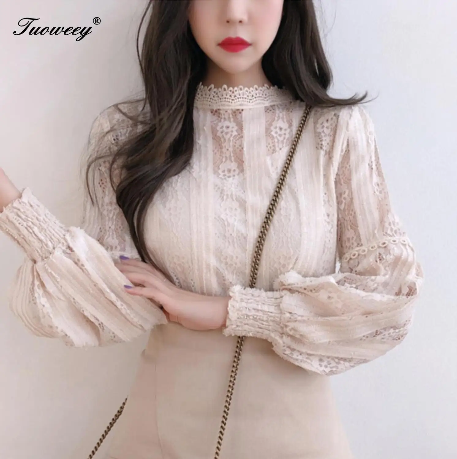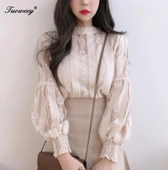 Ideal 2019 Women blouse Hollow out sexy Lace Tops Ladies blusas femininas elegante Lantern sleeve Casual