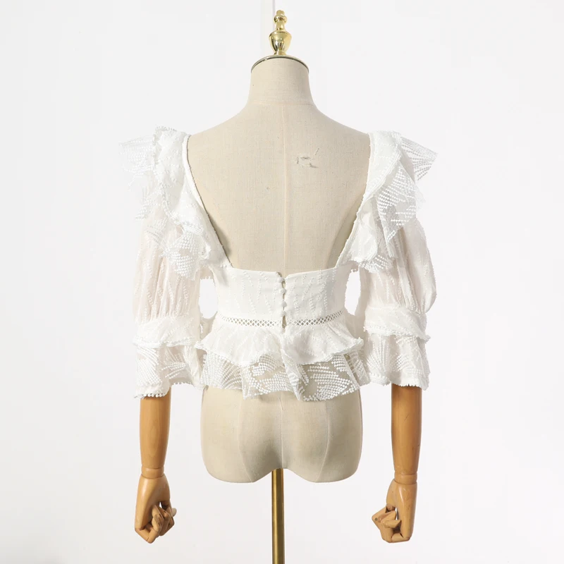 low cost [LIVIVIO] Ruffle Lace Blouse Women White Shirt 2019 Autumn Sexy Ladies Square Neck Tops Puff Sleeve