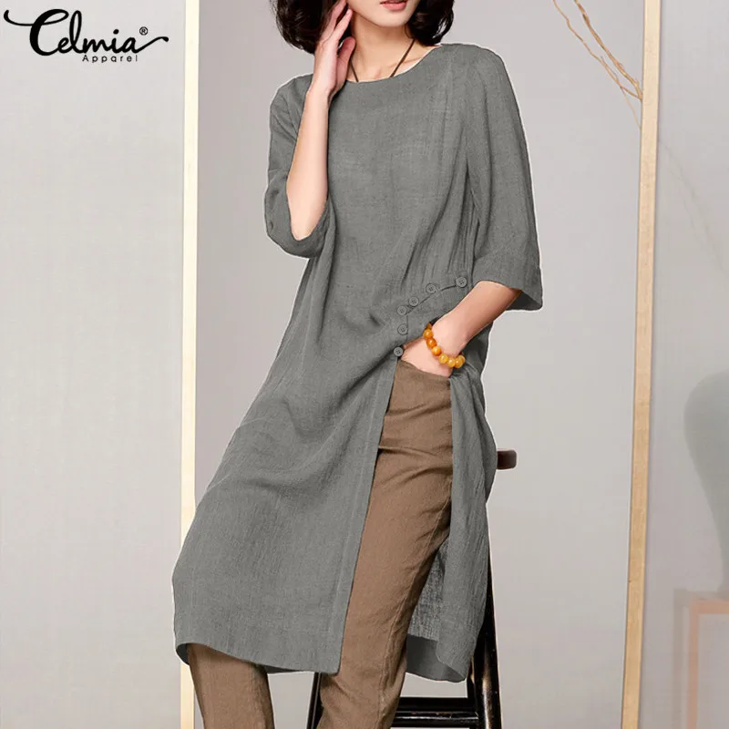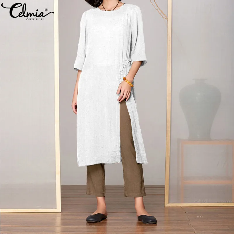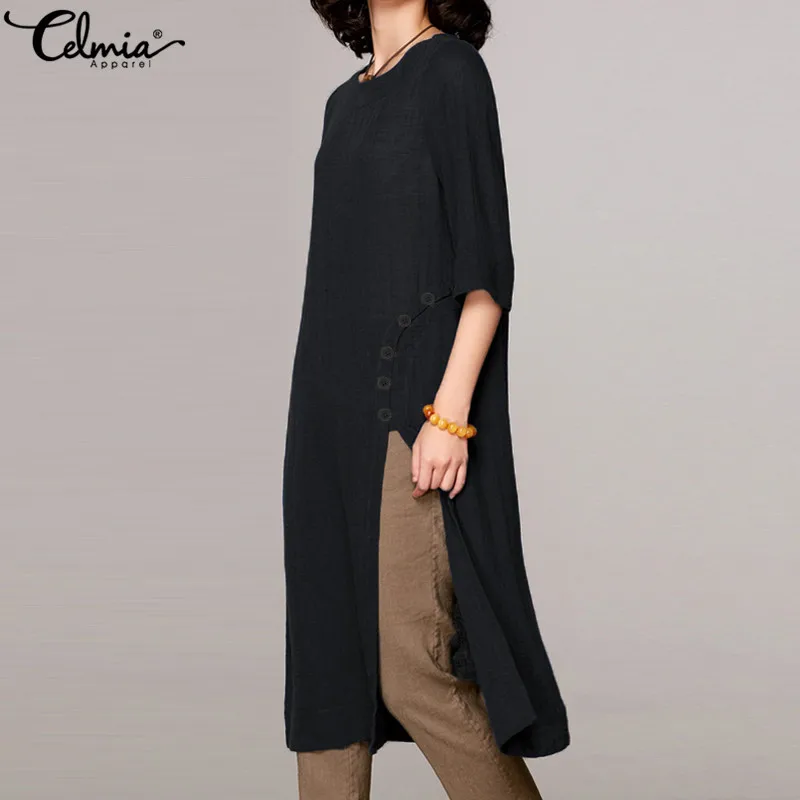 New S-5XL Celmia 2019 Summer Women Blouses Vintage Linen Tops Half Sleeve Loose Split Long Shirts Casua