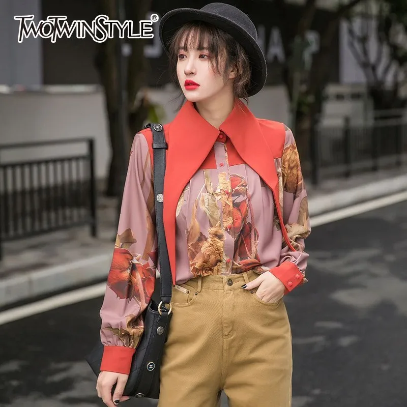 discount TWOTWINSTYLE Womens Shirts Blouse Lapel Collar Long Sleeve Patchwork Print Tops Female Spring 2019