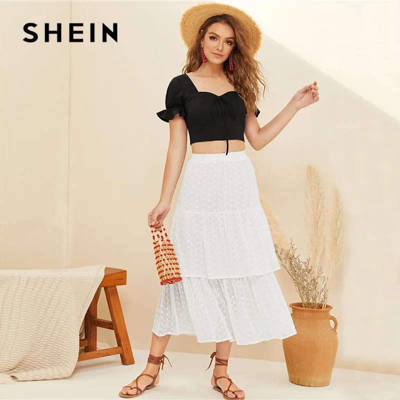 discounted SHEIN Bow Front Shirred Back Crop Top 2019 Boho Beach Sweetheart Neck Black Summer Blouse Cute Slim