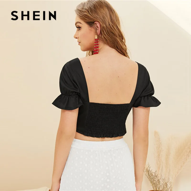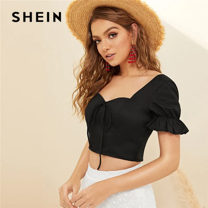remarkable SHEIN Bow Front Shirred Back Crop Top 2019 Boho Beach Sweetheart Neck Black Summer Blouse Cute Slim