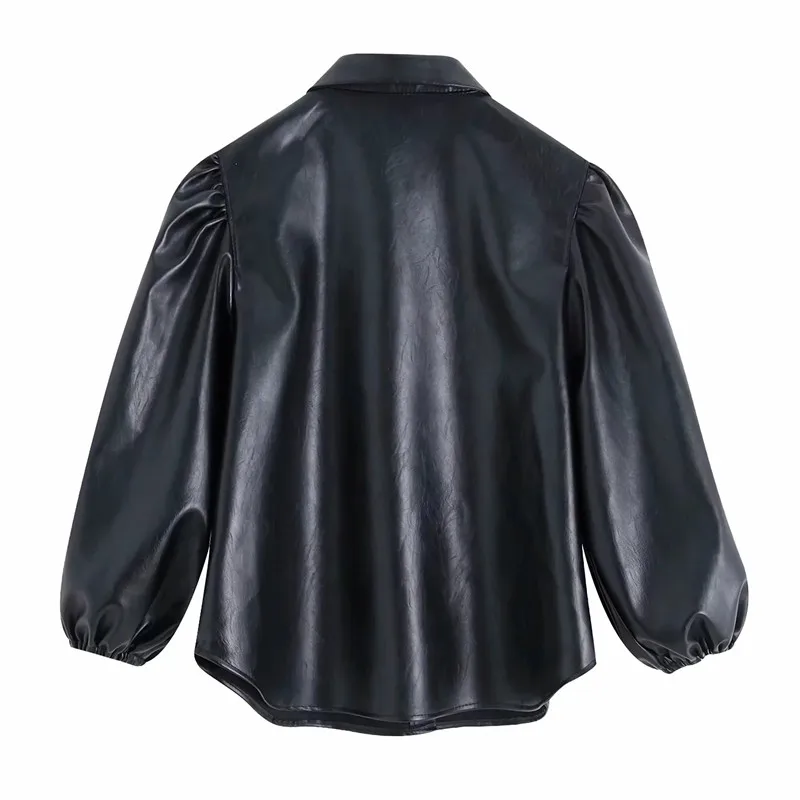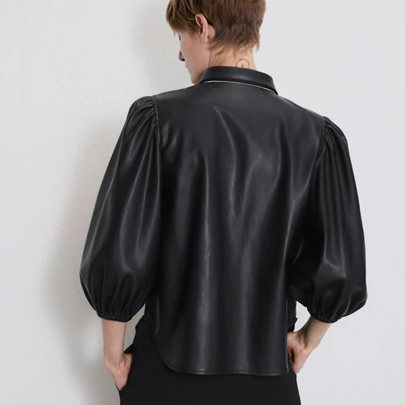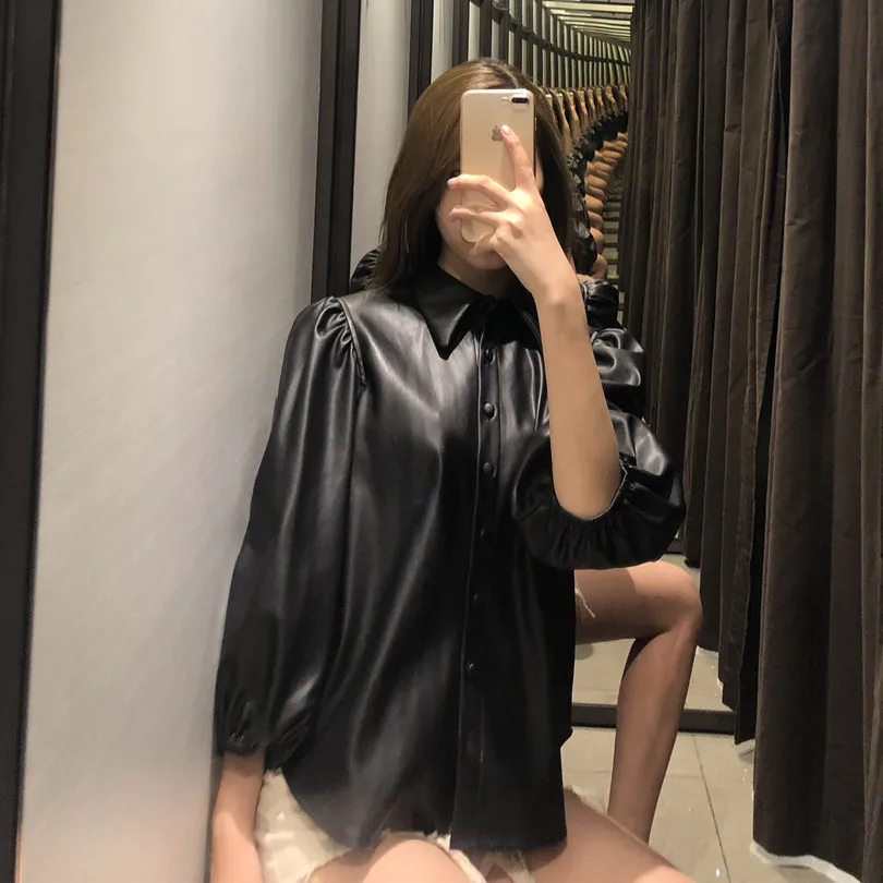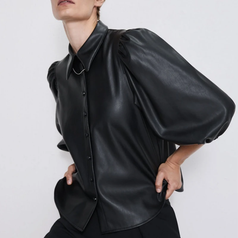 price reduction Black PU faux leather blouse women puff sleeve blouse with buttons winter blouse lantern sleeve fau
