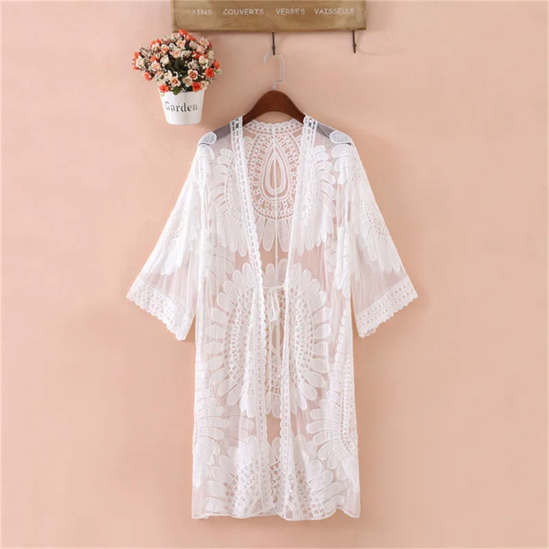 awesome New Summer Swimsuit Lace Hollow Crochet Beach Bikini Cover Up 3/4 Sleeve Women Tops Swimwear Beach