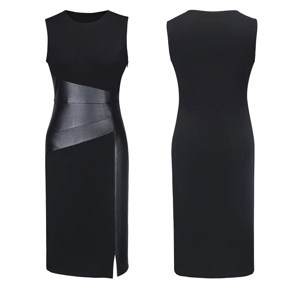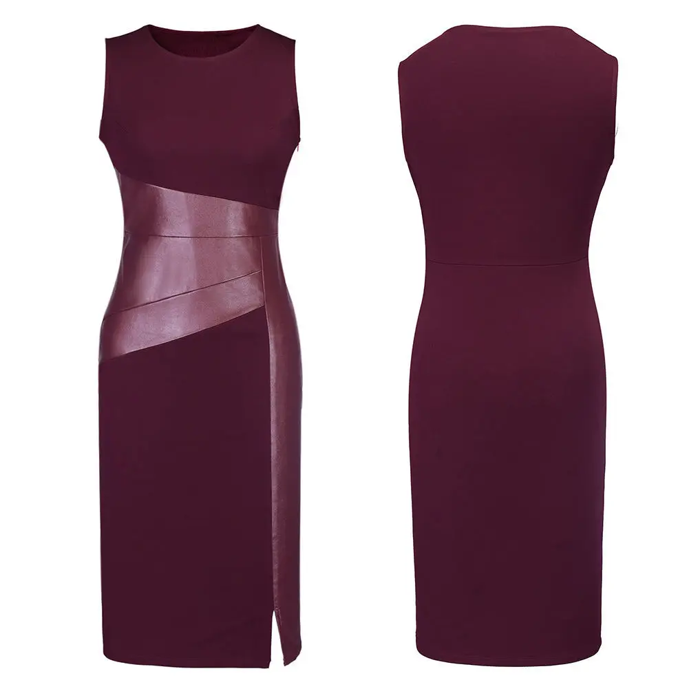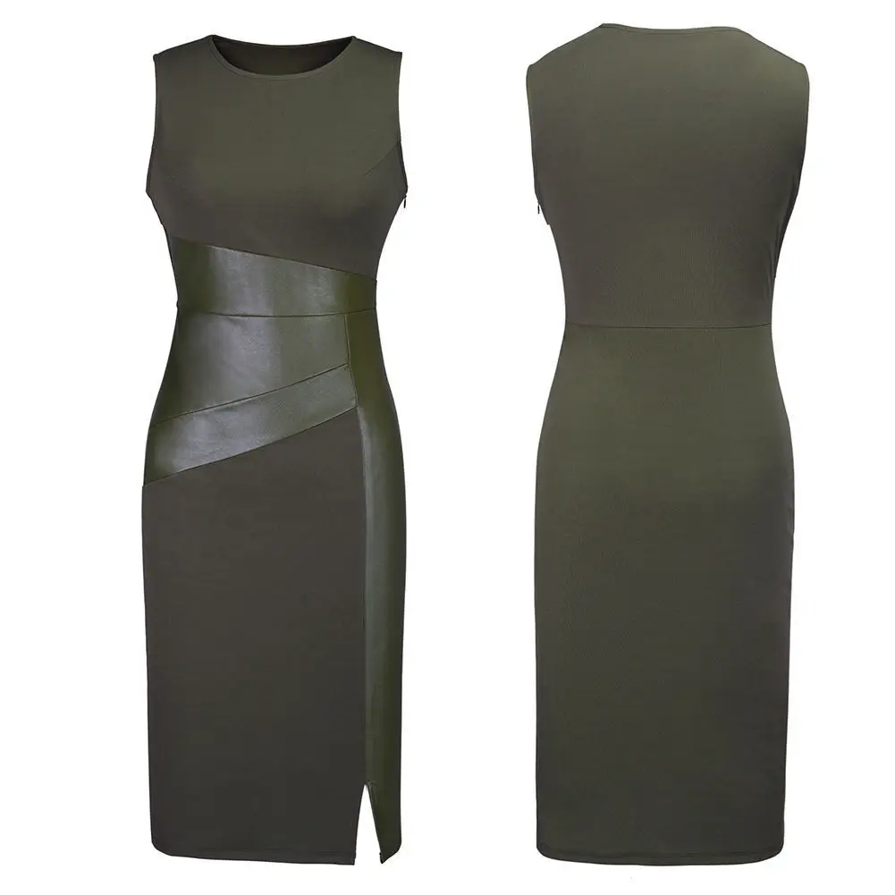 wonderful Sexy Women Sleeveless Patchwork PU Leather Dress Wine Red Black Army Green Low Cut Bodycon Evening