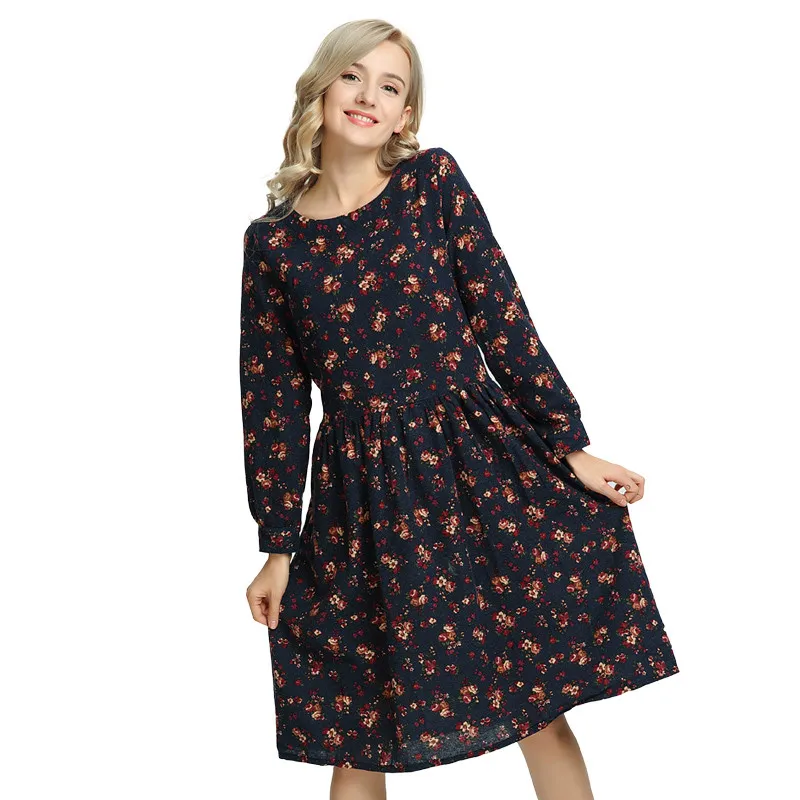 Very best 2019 New Women Dresses Autumn Winter Vintage Print Casual Long Sleeve Retro Cotton Maxi Robe Tunic